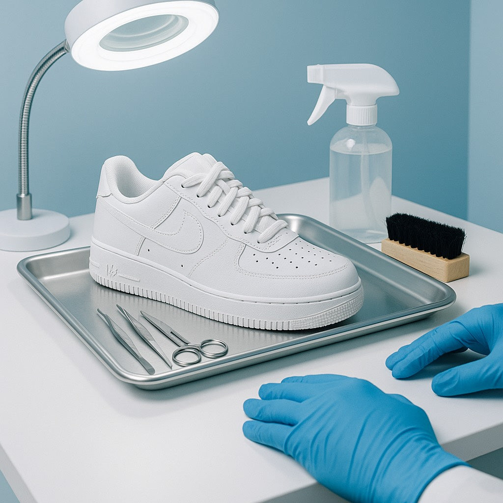 Once the cleaning is complete, each pair goes through a detailed final inspection. Our specialists place the shoes on a sterile tray—just like surgical tools—and review every inch under bright lights to ensure a flawless finish.